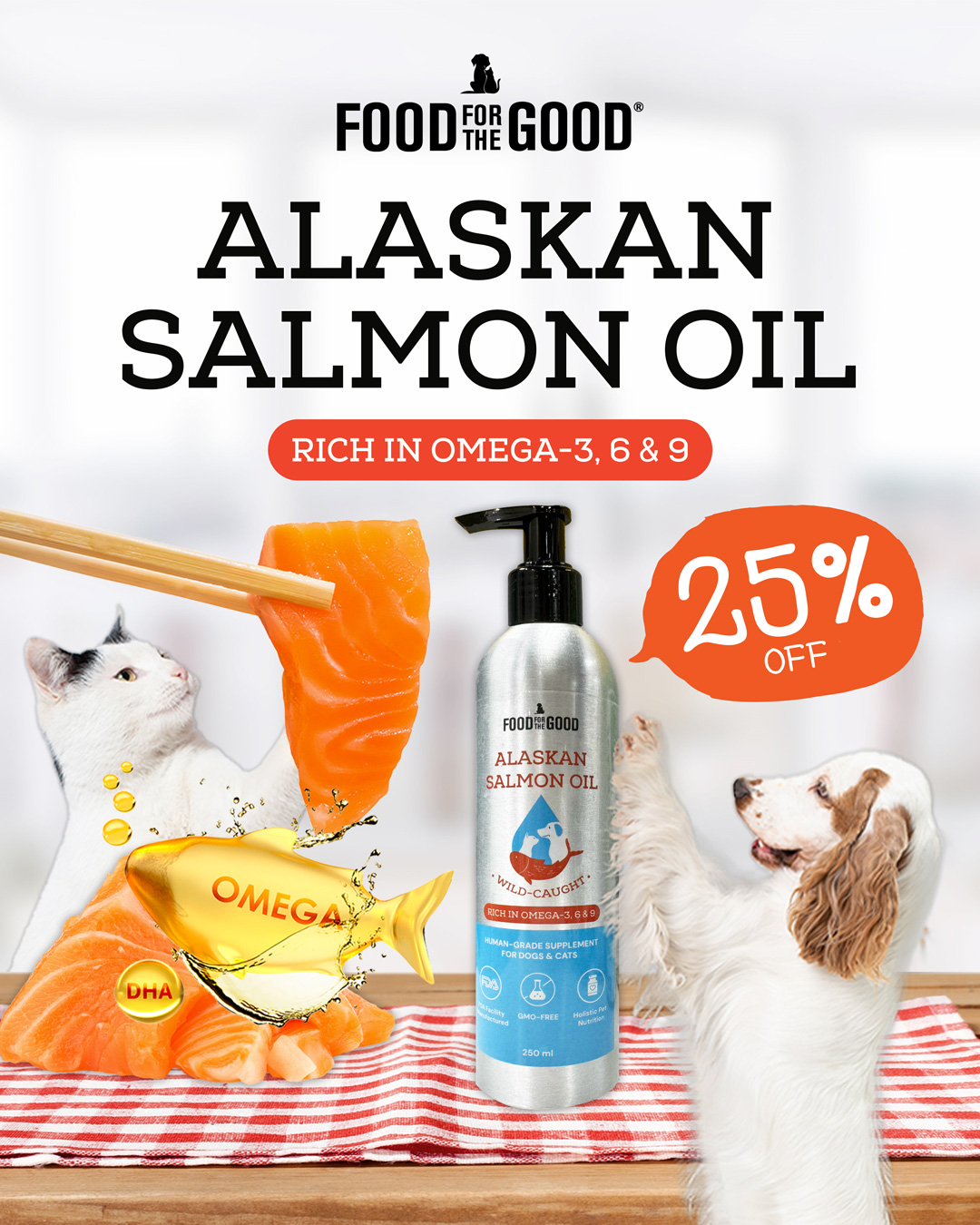 Food for the Good Alaskan Salmon Oil for Pets is sustainably sourced from the icy, pristine waters of the North Pacific, ensuring the highest quality and purity. Packed with essential Omega-3 fatty acids, this nutrient-rich supplement supports your pet’s overall vitality.
