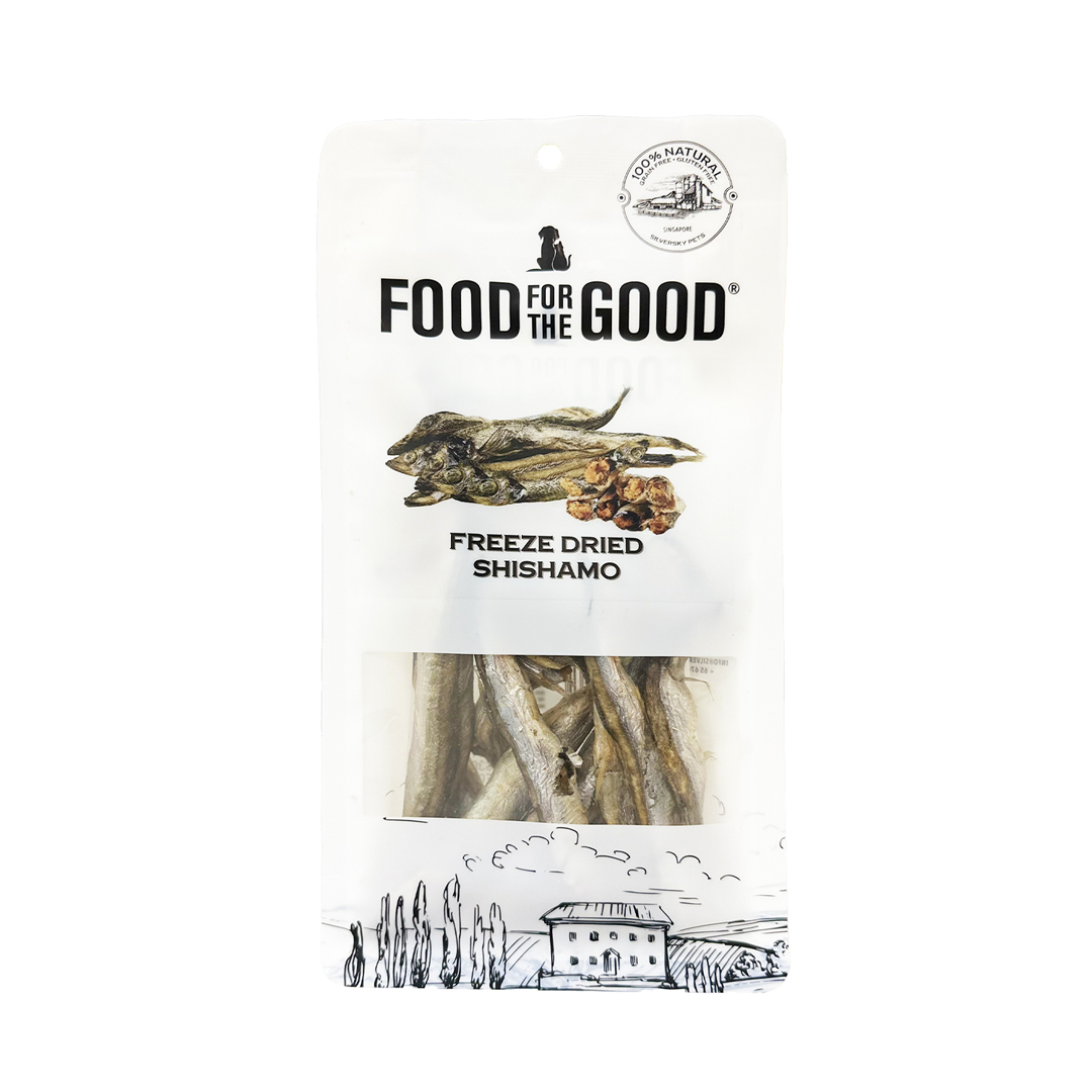 Food For The Good Freeze Dried Shishamo is an excellent source of protein, suitable for both dogs and cats. Made from 100% Shishamo, the treats are gently Freeze Dried to retain all the nutrients and flavor your pet craves! These treats are grain-free, gluten-free, without any added preservatives and antibiotics.