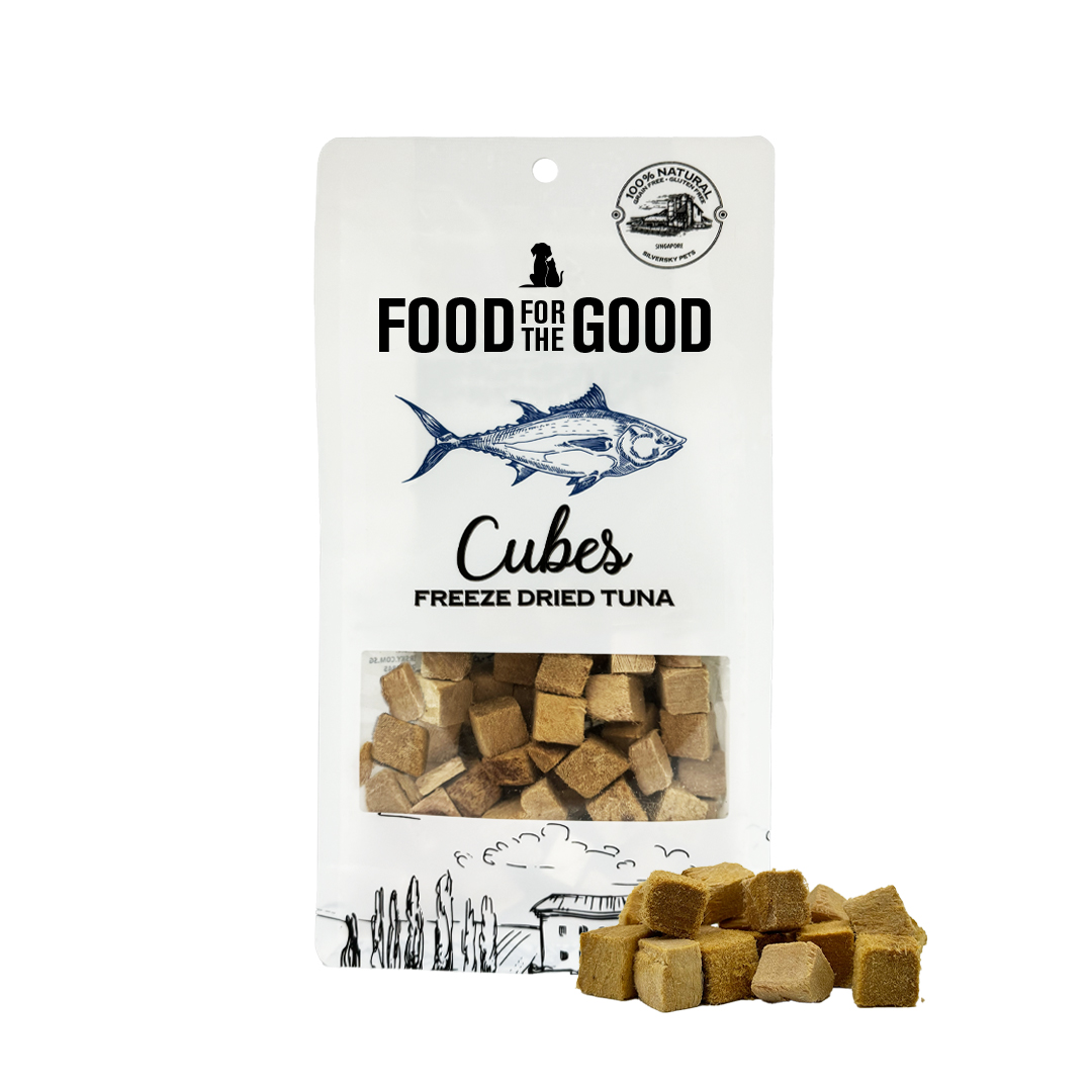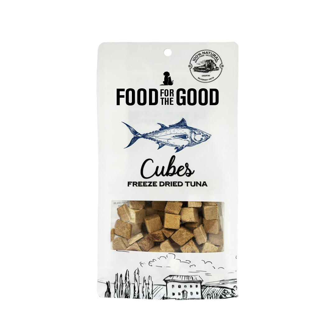 Food For The Good Freeze Dried Tuna Cubes is an excellent source of protein, suitable for both dogs and cats. Made from 100% Tuna, the treats are gently Freeze Dried to retain all the nutrients and flavor your pet craves! These treats are grain-free, gluten-free, without any added preservatives and antibiotics.