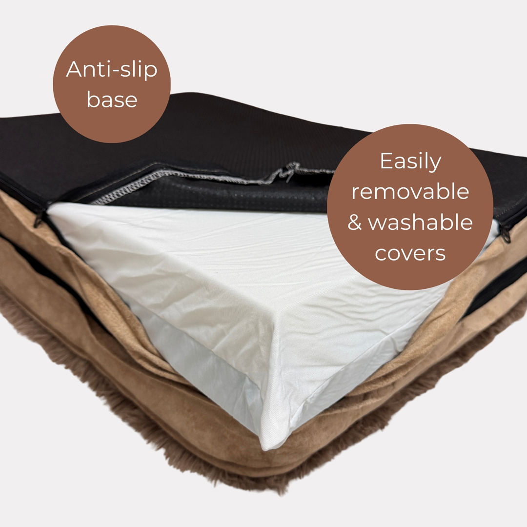 Designed to ease anxiety and support restful sleep, the Elysian Orthopaedic & Anti-Anxiety Dog Bed features ultra-soft lightweight faux fur that mimics a mother’s warmth, helping dogs feel calm and secure. Orthopaedic memory foam with a gel-infused top layer cushions joints, relieves pressure points, and keeps your pup comfortable. With a waterproof inner lining and machine-washable cover, it’s built for everyday ease. Made with CertiPUR-US® certified foam and OEKO-TEX® STANDARD 100 fabric, it’s safe for pets, people, and the planet.