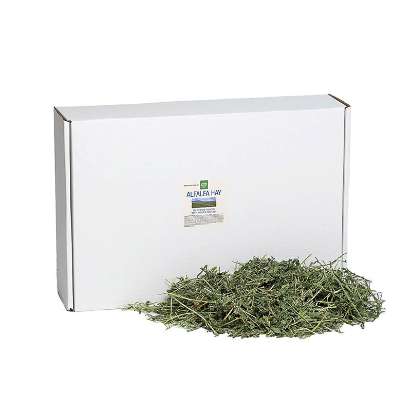 Alfalfa hay offers the same long-strand high fiber that Timothy hay offers, but with higher levels of energy, protein, and calcium. This hay features small clover-like leaves, branching stems, and small flower clusters.