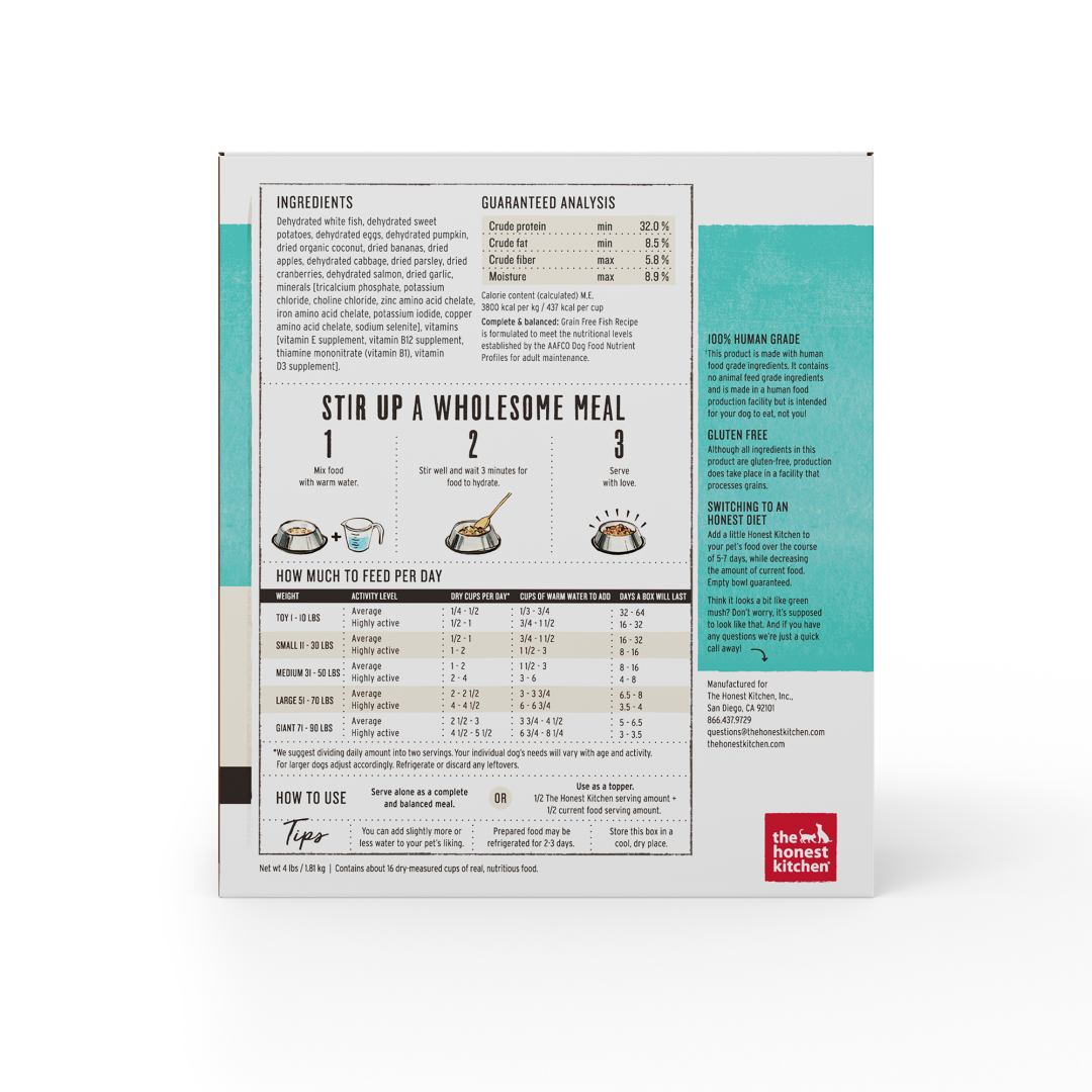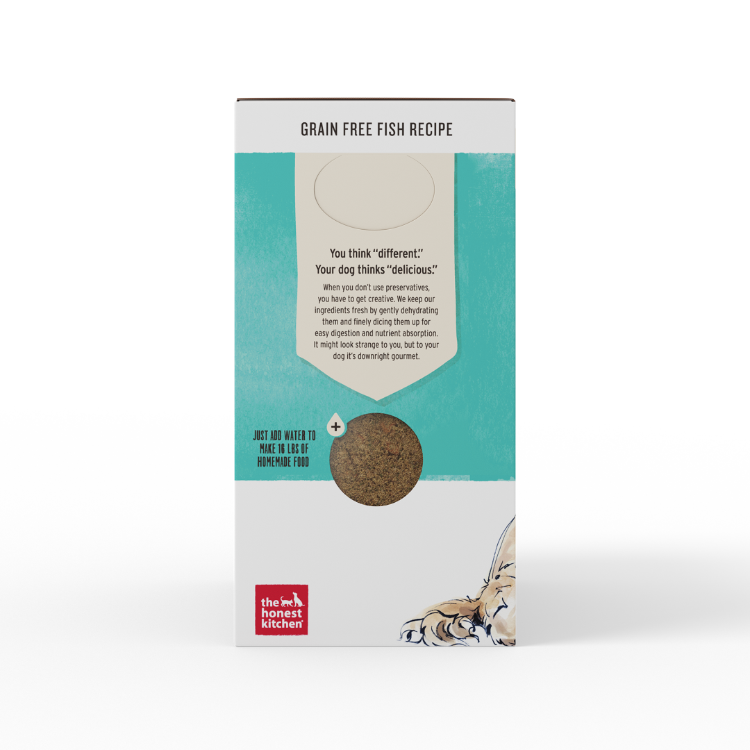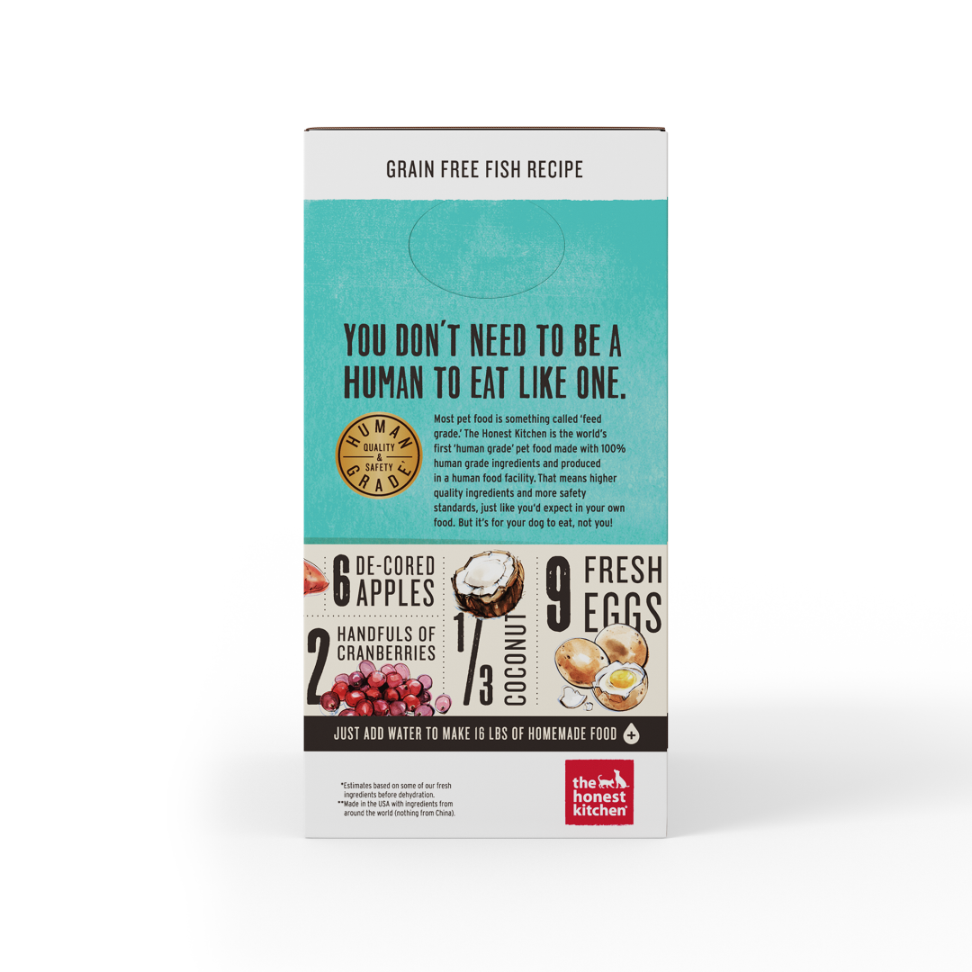 The Honest Kitchen believes human grade, whole foods provide pets the best nutrition possible. This grain free recipe is made with uncompromising quality control standards using real, whole food ingredients, like wild caught fish, that are gently dehydrated to maintain nutrients & taste. To meet our 100% human grade standard, we use the same whole food ingredients you’d recognize in your own kitchen, and make this food in a human food facility. Just add warm water and wait three minutes for a fresher, homemade meal that you and your pets will love!
