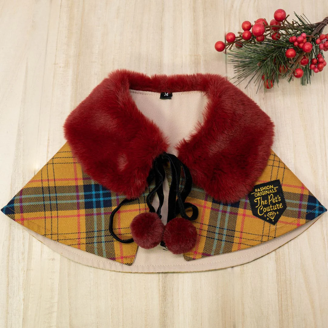 The Pet’s Couture Red Black Tartan Cape with Gold Trimming Collar