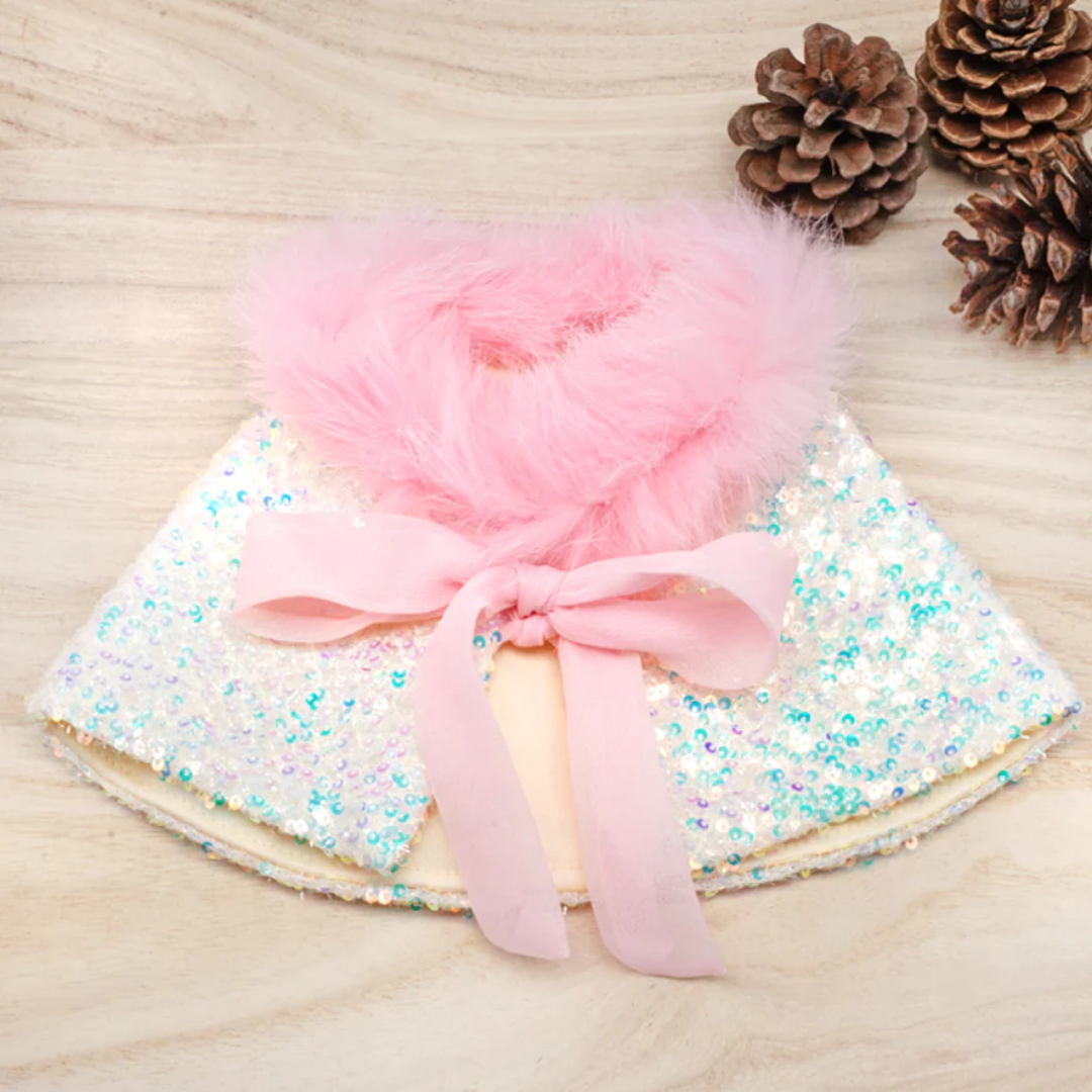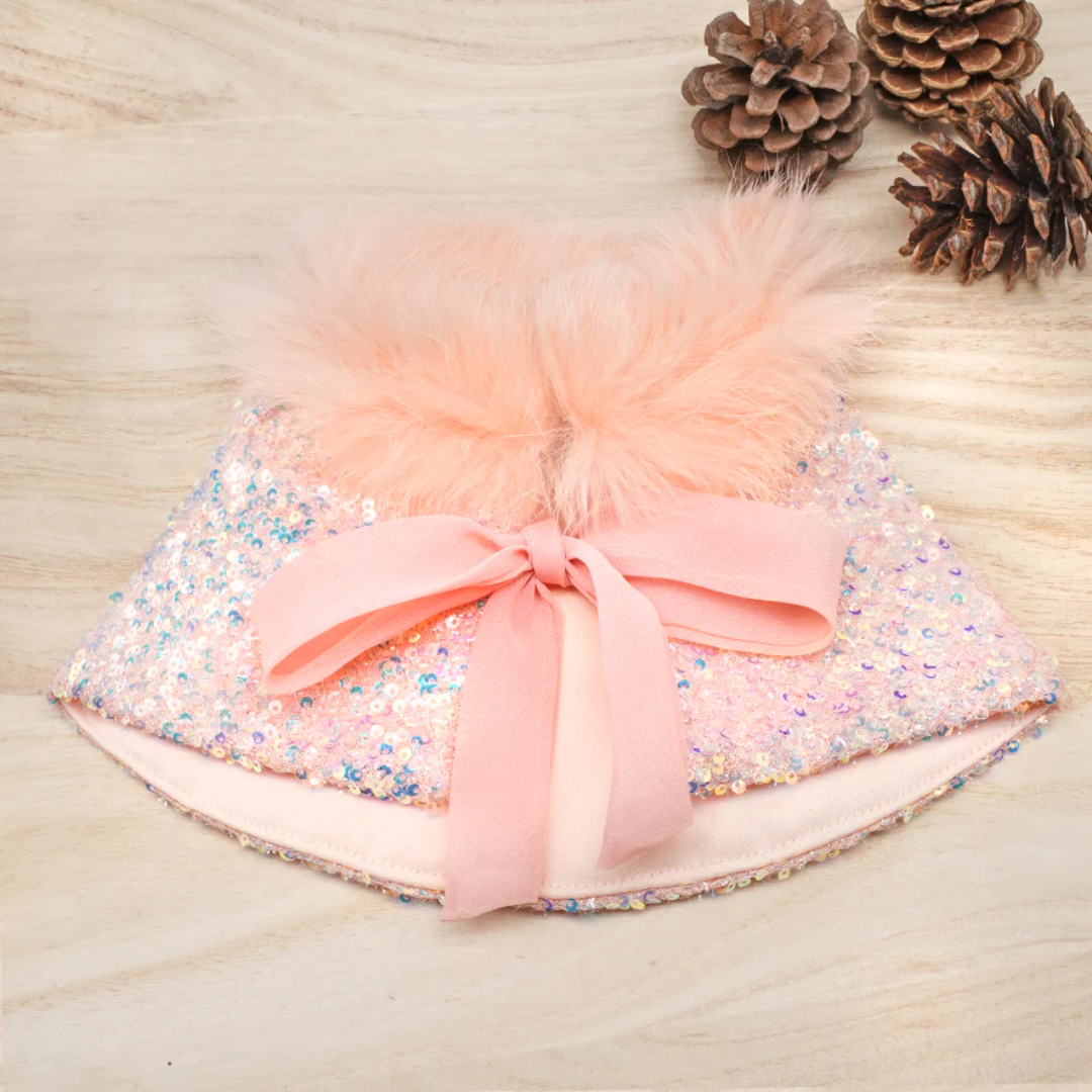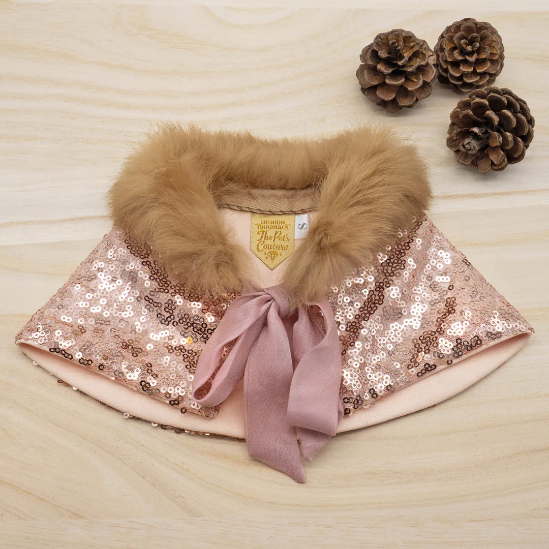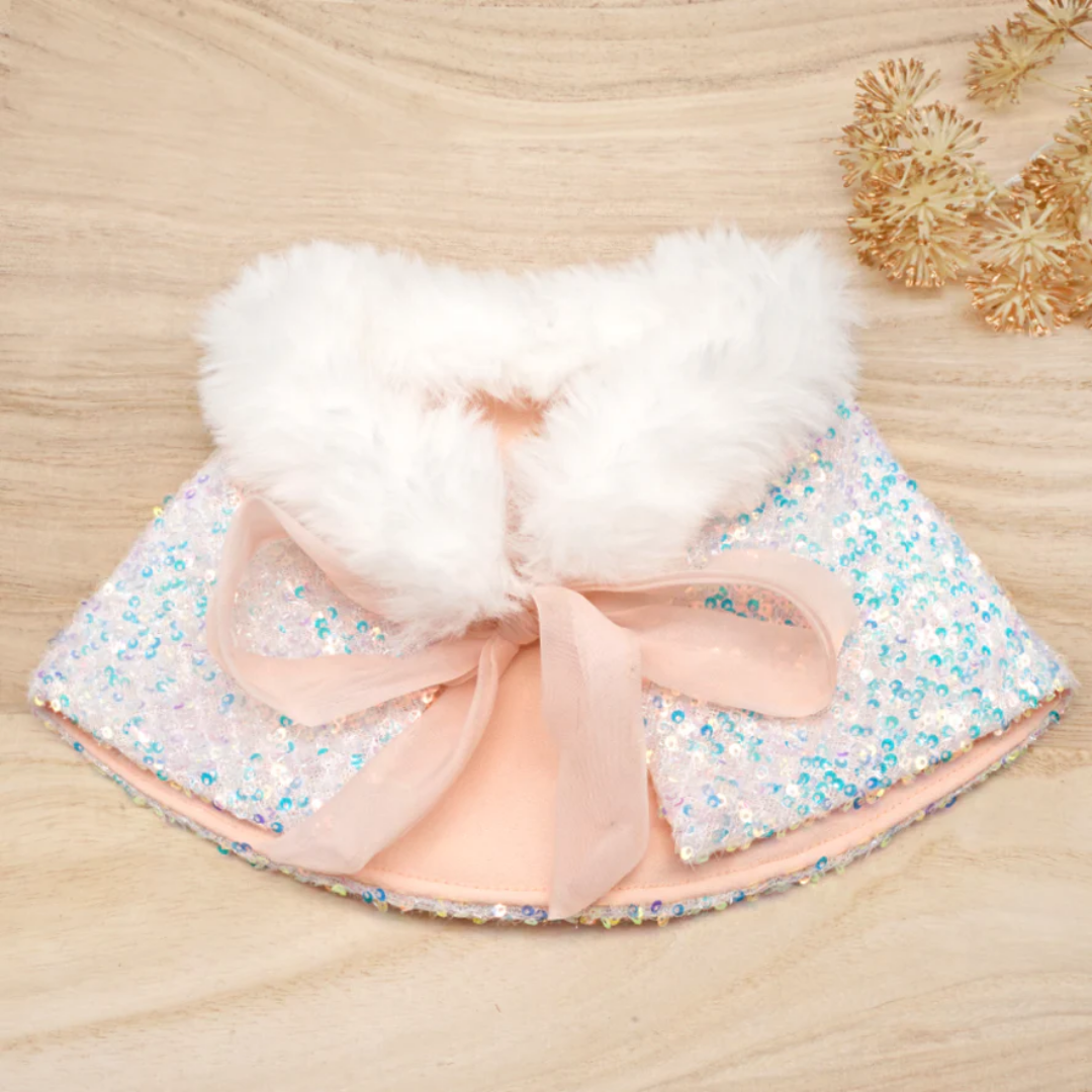 This beautifully sequin-embellished glitter cape is accented with faux fur panels and co-ordinating sequin details. Design and handmade by our dedicated TPC production team of artisans, only quality imported fabrics is screened and selected with our highest standard of workmanship just for you. Style and comfort made in mind for your pet. Perfect for a fashionable night out on the town or it can be worn just about anywhere!