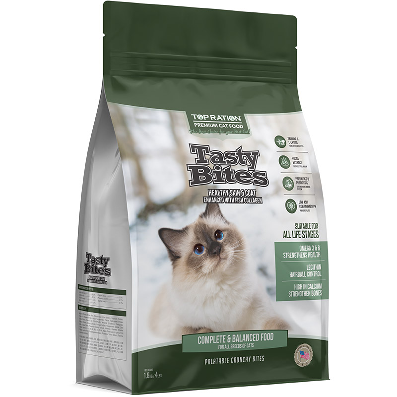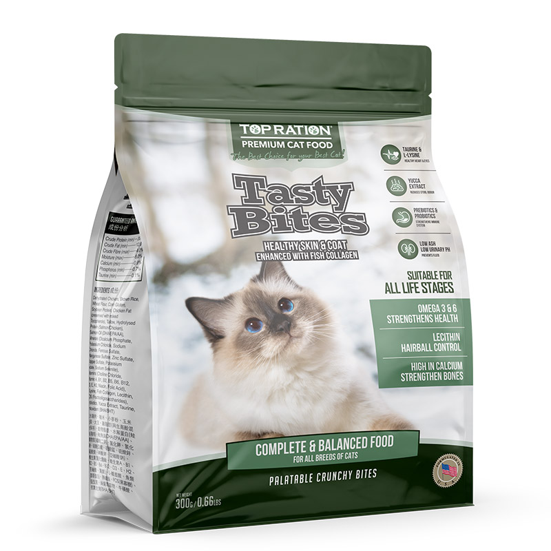 Dehydrated chicken, brown rice, wheat flour, corn gluten, soybean protein, chicken fat (preserved with mixed tocopherols), tallow, hydrolyzed protein (salmon/chicken), salmon oil (DHA/EPA/AA), minerals (dicalcium phosphate, potassium chloride, sodium chloride, ferrous sulfate, manganese sulfate, zinc sulfate, copper sulfate, potassium iodate, sodium selenite), vitamins (choline chloride, vitamin A, B1, B2, B5, B6, B12, D3, E, H2, niacin, folic acid), L-lysine, fish collagen, FOS (Frutooligosaccharides), probiotics, yucca extract, taurine, antioxidant (BHA/BHT)