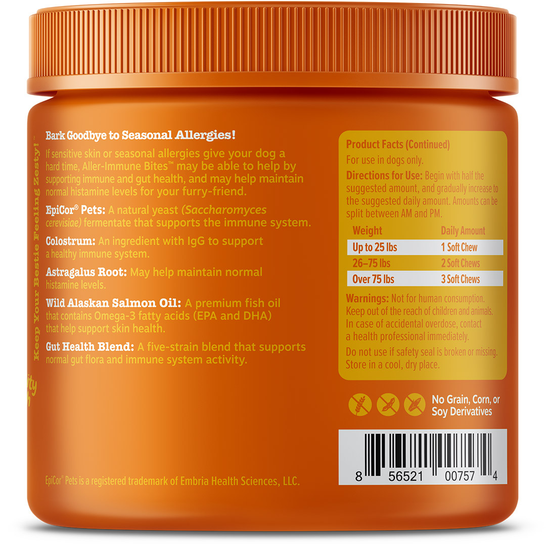 - Support the immune system – Zesty Paws Aller-Immune Bites are soft chews that support immune, histamine, and digestive health for dogs with skin, seasonal, and environmental allergies.