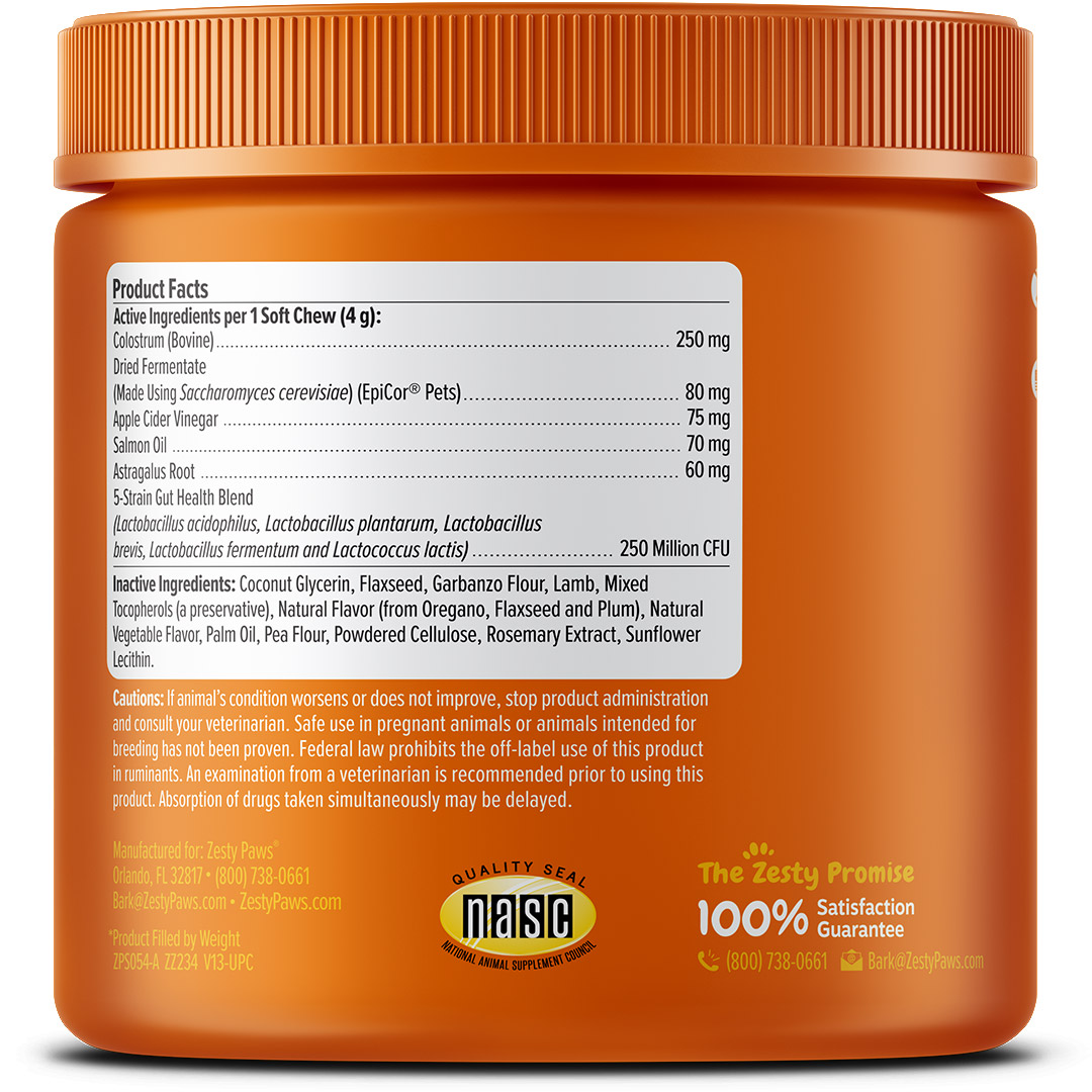 Active: Colostrum 250 mg EpiCor® Fermentate (Made Using Saccharomyces cerevisiae) 80 mg Apple Cider Vinegar 75 mg Salmon Oil 70 mg Astragalus Root 60 mg 5-Strain Probiotic Blend (Lactobacillus acidophilus, Lactobacillus plantarum, Lactobacillus brevis, Lactobacillus fermentum and Lactococcus lactis) 250 Million CFU. Inactive: Coconut Glycerin, Flaxseed, Fructooligosaccharides, Garbanzo Flour, Lamb, Mixed Tocopherols, Natural Flavors (from Oregano, Flaxseed and Plums), Palm Fruit Oil, Pea Flour, Powdered Cellulose, Rosemary Extract, Sunflower Lecithin