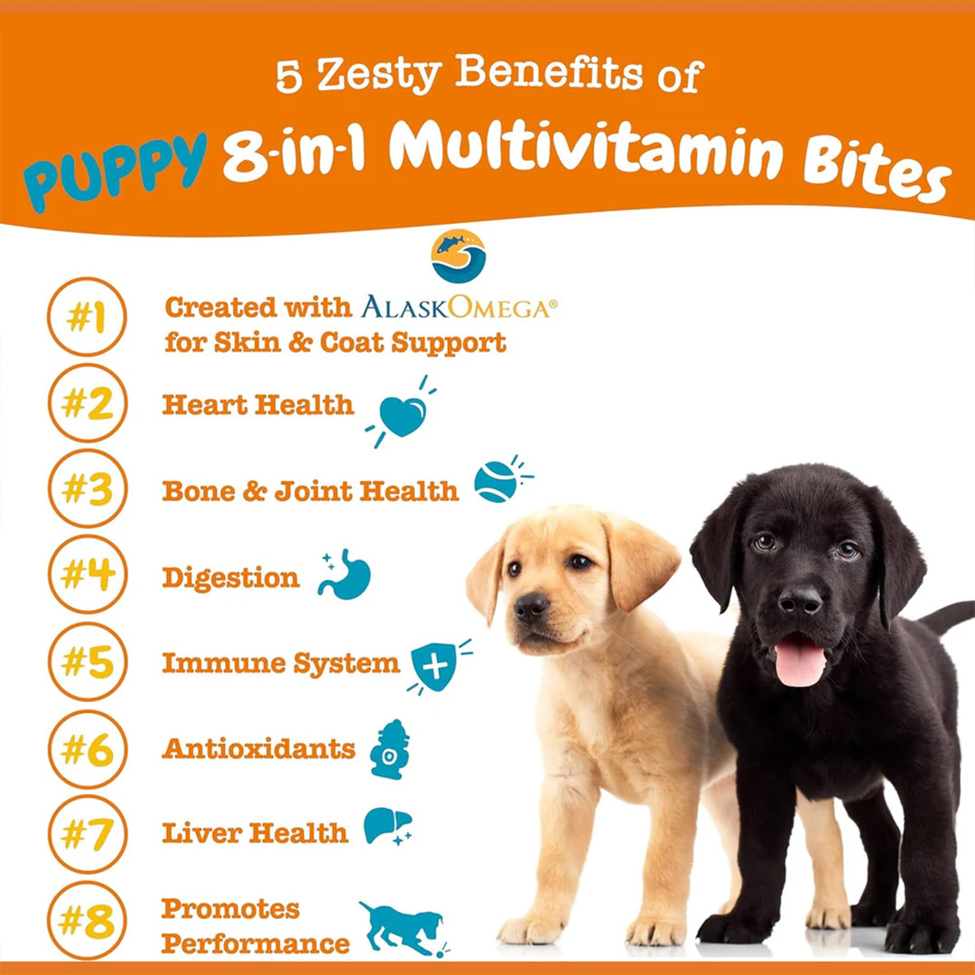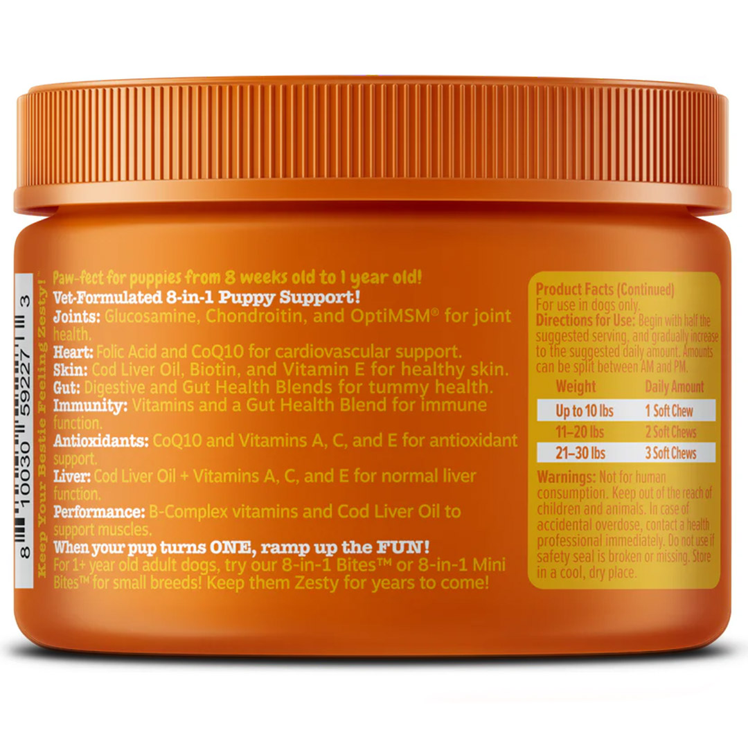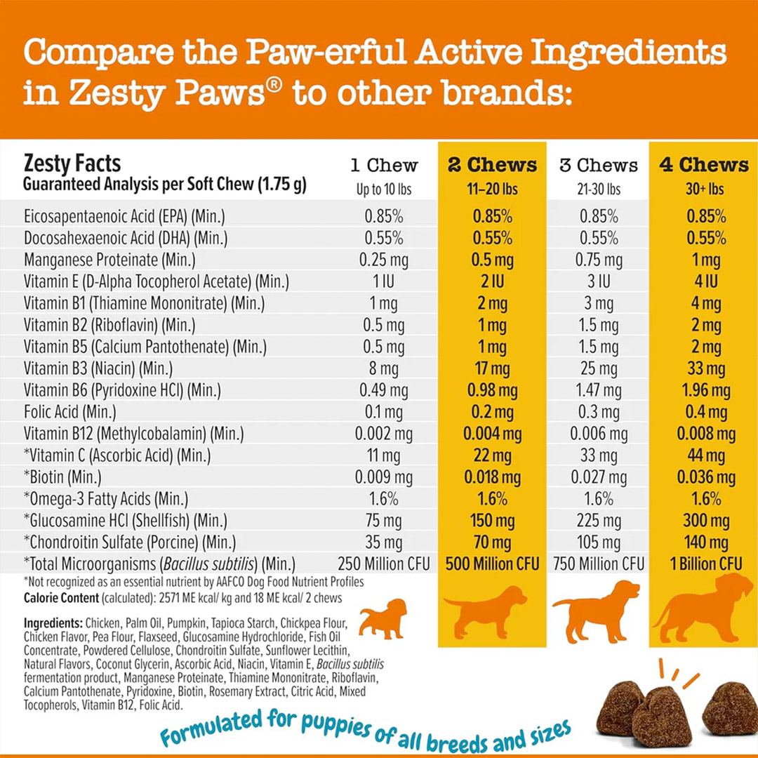 If you love your puppy from head-to-tail, Zesty Paws has eight great ways to help you show it! Puppy 8-in-1 Multivitamin Bites provide multifunctional support to help your puppy grow up Zesty. These chews support hip and joint function, heart health, skin and coat health, digestion, the immune system, antioxidant activity, liver health, and performance for small puppies. That’s because this chewable functional supplement contains Glucosamine, Chondroitin, Bacillus subtilis, and a whole lot more! Best of all, these bite-sized doggie chewables taste delicious (trust us, we have a hot spot where official four-legged testers tell us) that’ll give pets an itch for more, and pet parents can let out a sigh of daily relief knowing that their canine companion will get multivitamins to keep them feeling Zesty and happy. Then, when your puppy turns 1, ramp up the fun and try our 8-in-1 Multivitamin Bites or 8-in-1 Multivitamin Mini Bites for small breeds to keep them Zesty for years to come!
